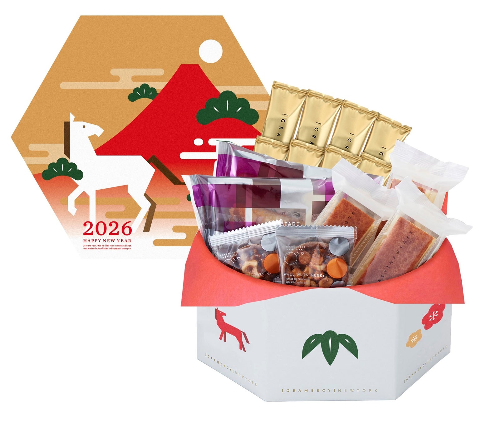 2026年の干支を箔で表現した華やかなボックスに、午年に合わせて開発したレディゴディバデザインの限定チョコレートなどを詰め合わせました