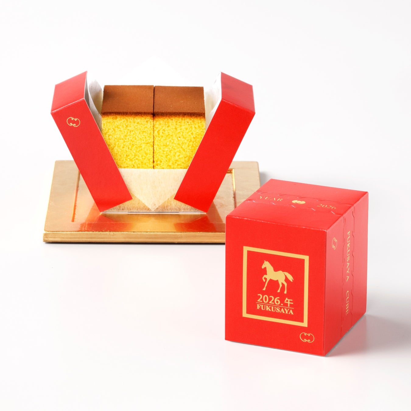 熟練した職人がひとつひとつ手づくりで作る伝統のカステラを、手軽にお楽しみいただける小箱「フクサヤキューブ」。干支柄の限定パッケージでご用意いたしました。