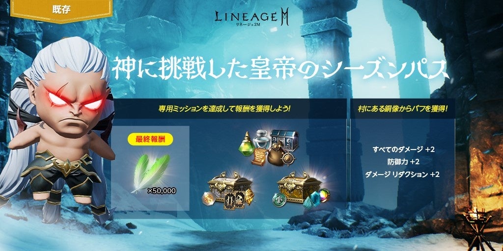 期間中、毎日達成していくデイリー ミッションと2週間でクリアを目指すシーズン ミッションで構成された、新規シーズンパス「神に挑んだ皇帝のシーズンパス」が登場します。デイリー ミッション、シーズン ミッションをそれぞれ達成してシーズンパスEXPを獲得し、パス レベルを上昇させることで、「神に挑んだ皇帝の宝箱(イベント)」や「バイウムの秘密の箱(イベント)」などのイベントアイテムのほか、「魔力が宿った羊皮紙(刻印)」「ピュアエリクサー(刻印)」など、様々なアイテムを報酬として獲得することができます。また、1,000,000アデナを使用することでプレミアム報酬を有効化することができます。最終報酬として、「アインハザードの祝福」20,000を獲得することが可能です。