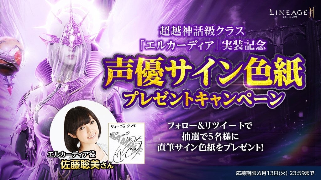 超越神話級クラス「エルカーディア」の実装を記念して、出演声優の直筆サイン色紙を抽選でプレゼントするフォロー&RTキャンペーンを実施します。