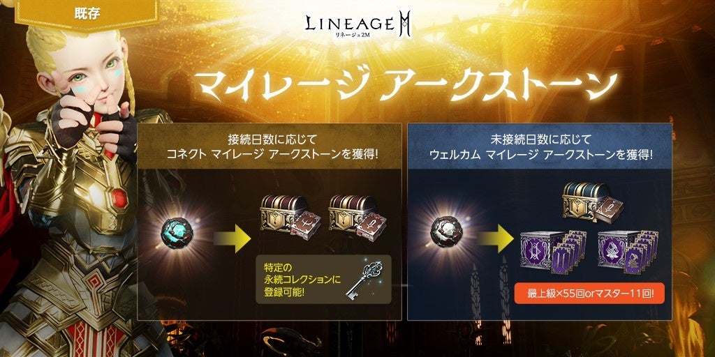 期間中、これまでの継承者様の継続的なゲームのプレイに感謝を込めて、累積接続日数に応じて「コネクト マイレージ アークストーン(イベント)」が、復帰された継承者様には未接続日数に応じて「ウェルカム マイレージ アークストーン(イベント)」をゲーム内郵便にてお送りします。