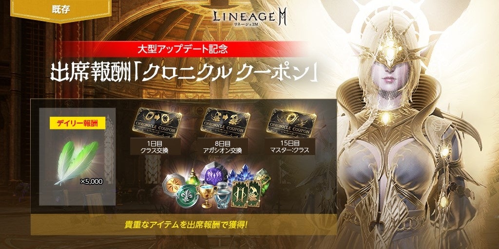 「クロニクル クーポン」では、デイリー報酬として、「アインハザードの祝福」5,000のほか、「クロニクル クーポン:クラス カード変更」「クロニクル クーポン:アガシオン カード変更」「クロニクル マスタークーポン:クラス」などのアイテムを獲得することができます。