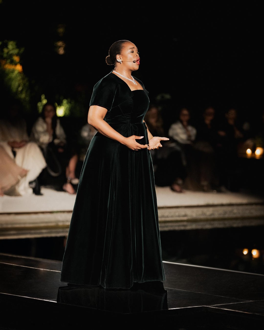プリティ・イェンデは、ダークグリーンのヴェルヴェット ロングドレスに身を包みパフォーマンスを披露しました。