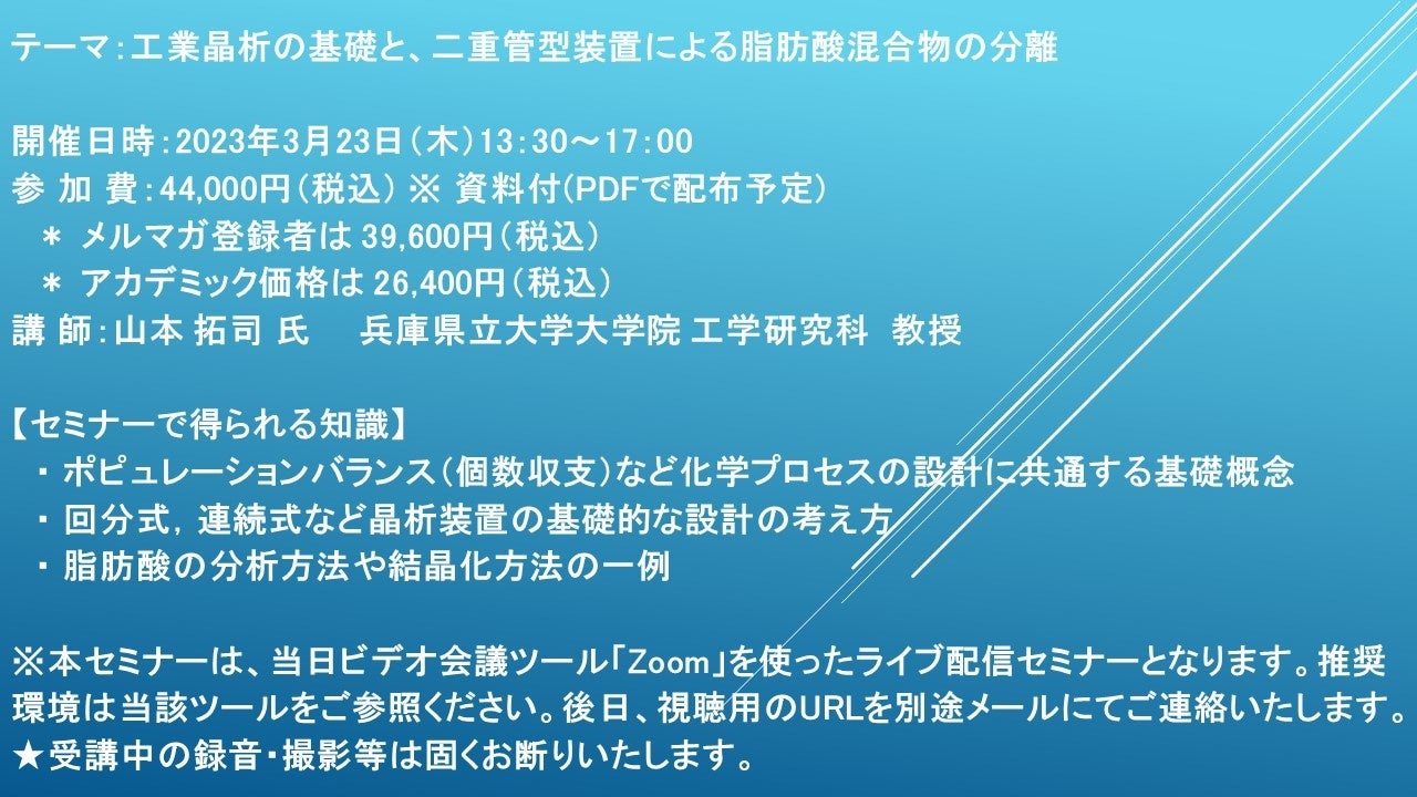 【ライブ配信セミナー】工業晶析の基礎と、二重管型装置による脂肪酸混合物の分離 3月23日(木)開催 主催:(株)シーエムシー・リサーチ