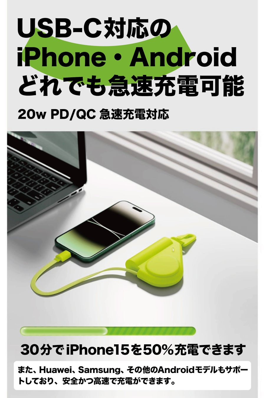 LightningとUSB-Cの両方に対応し、iPhoneやAndroidなど様々なモバイル機器を充電可能。