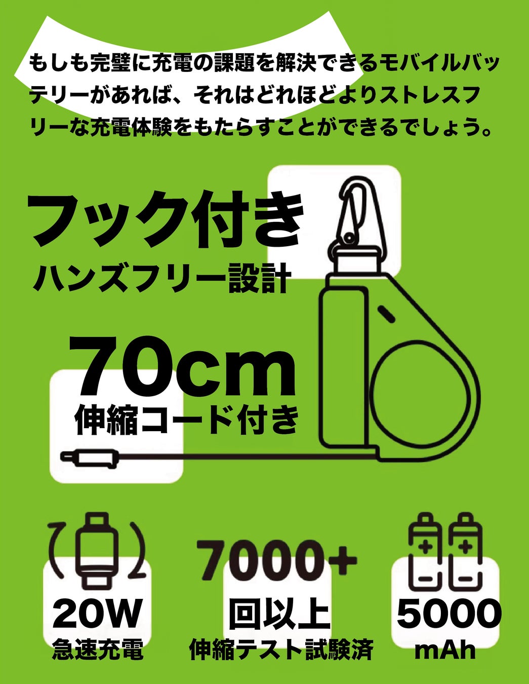 【5000mAh/最大20W急速充電/Lightning・USB-C両対応/最長70cm伸縮ケーブル】