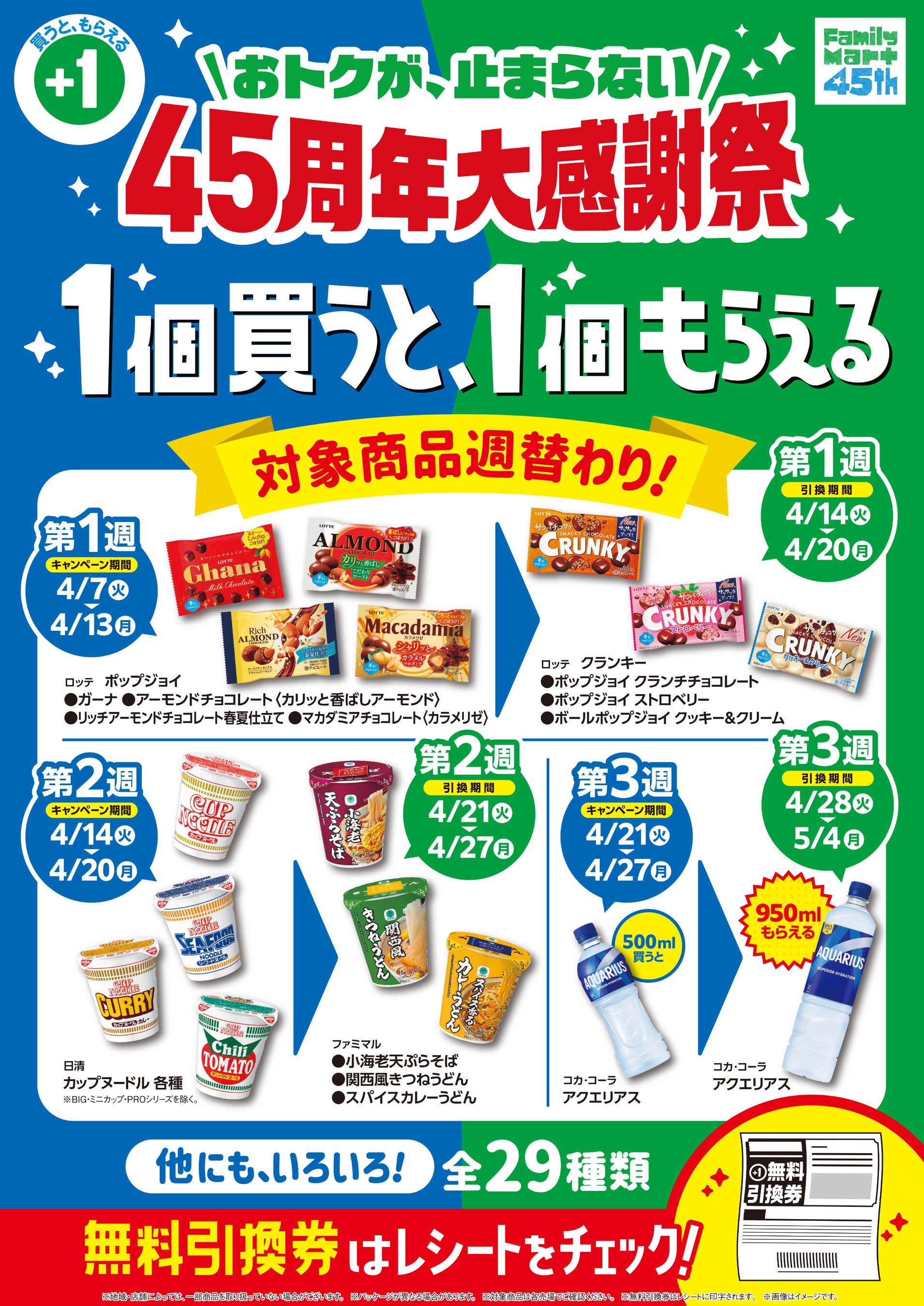 おトクが、止まらない 45周年大感謝祭!1個買うと、1個もらえる!対象商品は週替わりで全29種類 人気のお菓子やカップ麺がおトクに手に入るチャンス!