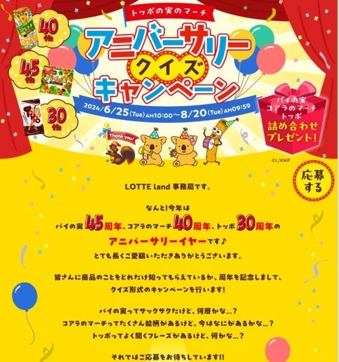 「トッポ」ブランド30周年、「パイの実」ブランド45周年、「コアラのマーチ」ブランド40周年を記念して、それぞれのブランドに関するクイズキャンペーンを実施します。クイズに挑戦して応募いただいた方の中から抽選で30名様に「トッポ」「パイの実」 「コアラのマーチ」の詰め合わせをプレゼントします。