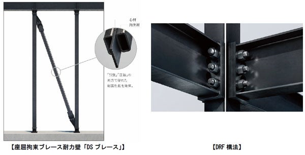 本商品には、超高層建築物にも使われる座屈拘束技術を、座屈拘束ブレース耐力壁「DSブレース」(※5)として採用。引張と圧縮の両方で耐震性能を発揮し、繰り返しの地震にも耐えられる設計としました。また、柱と梁の接合部分を厚鋼板で補強するとともに、国土交通大臣認定を取得した特殊高力ボルトで接合する「DRF構法」(※6)の技術を採用することで、強固な構造躯体を実現。柱の間隔を広げることができるため、プランの自由度を高めることができます。