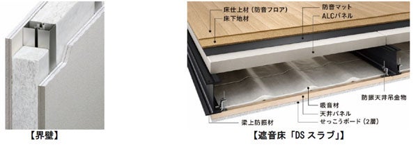 「THE STATELY」では、住戸間の生活音に配慮した界壁や、上下階に響く音を抑制する遮音床「DSスラブ」(※7)を界床に採用しました。