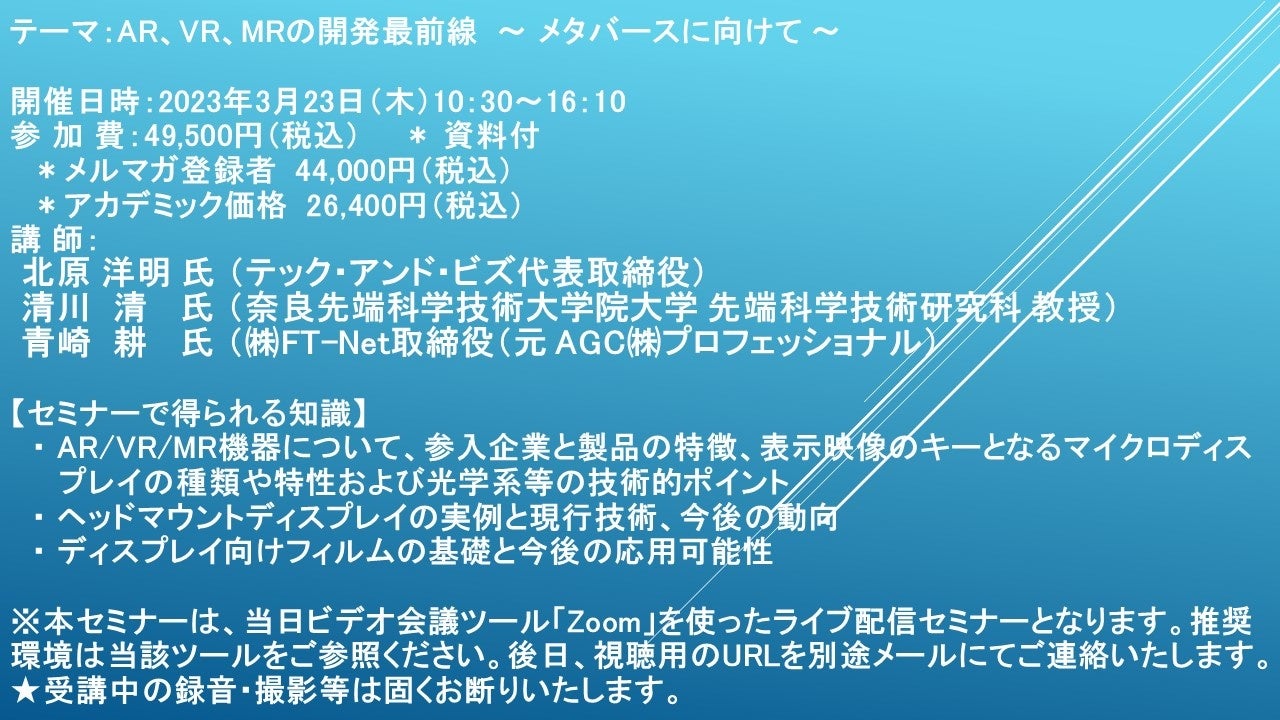 【ライブ配信セミナー】AR、VR、MRの開発最前線 ~ メタバースに向けて ~ 3月23日(木)開催 主催:(株)シーエムシー・リサーチ