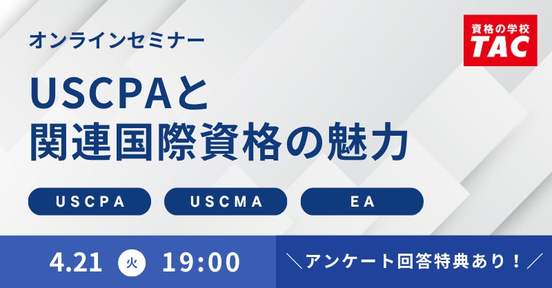 【資格の学校TAC】オンラインセミナー「USCPAと関連国際資格の魅力」 2026年4月21日(火)19:00開催!