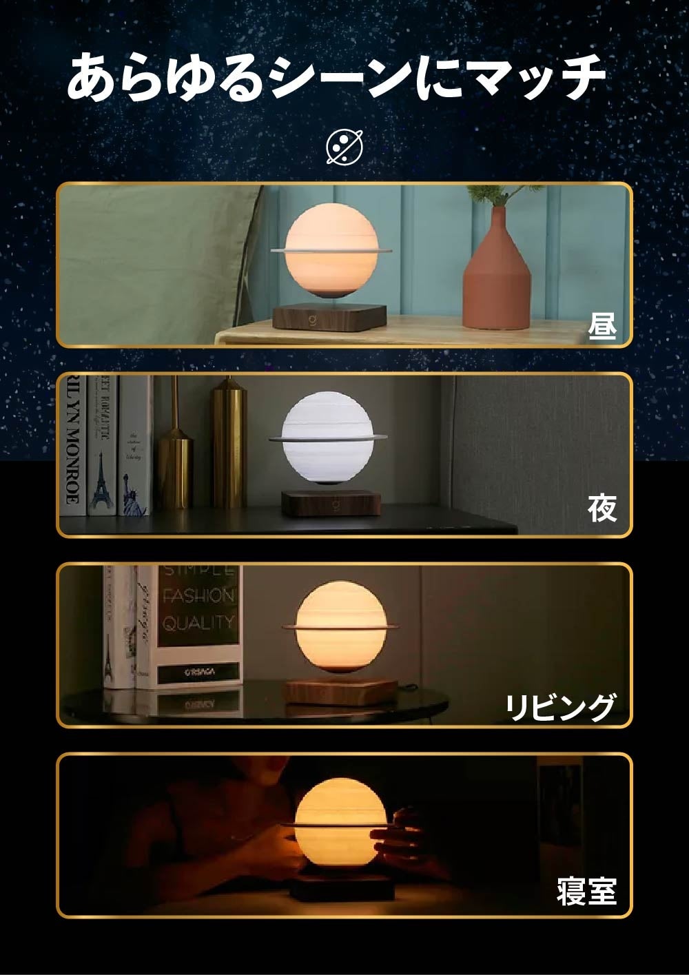 Saturn-Gを使用開始に際しては、木星を土台へとゆっくり降ろすことにより、LEDが点灯し磁力が上向きに抵抗し浮揚します。手を離すと自動的に中央に配置され、心地よく回転し始めます。発光体のバランスをとったり、細かく難しい設定をする必要はありません。