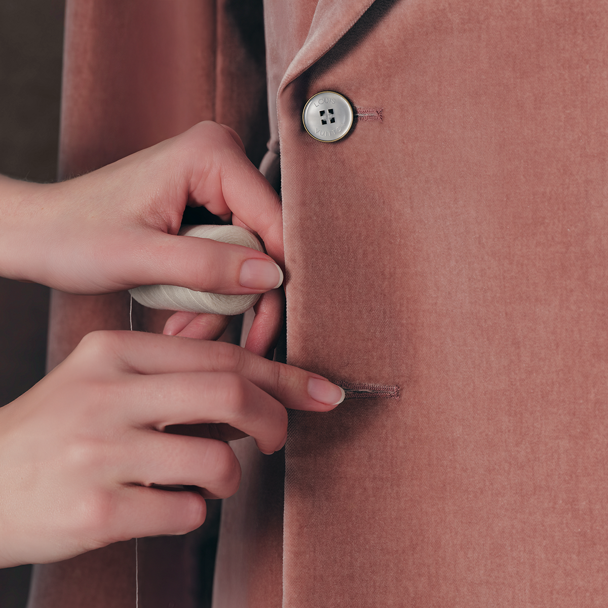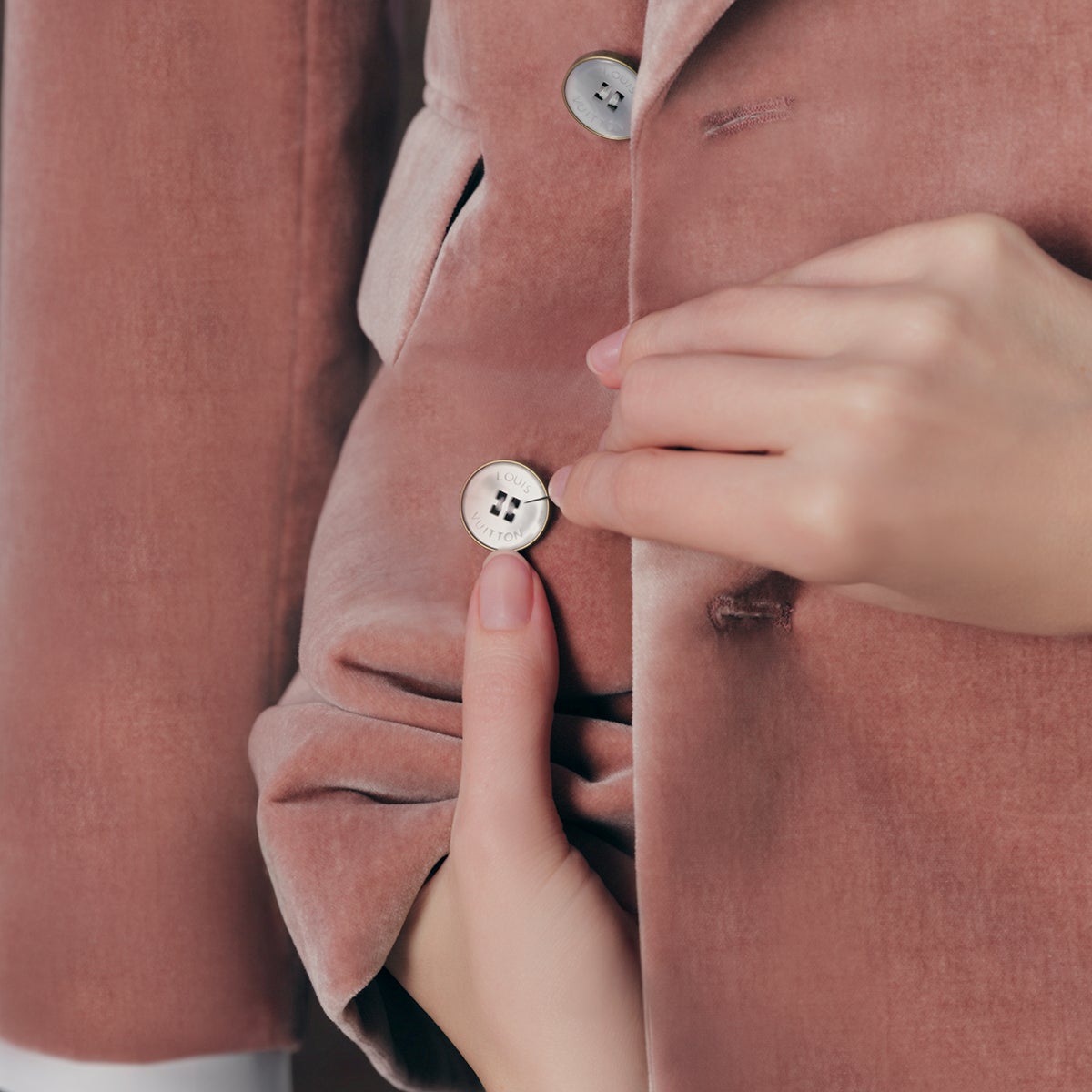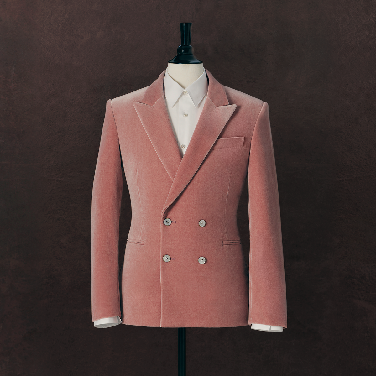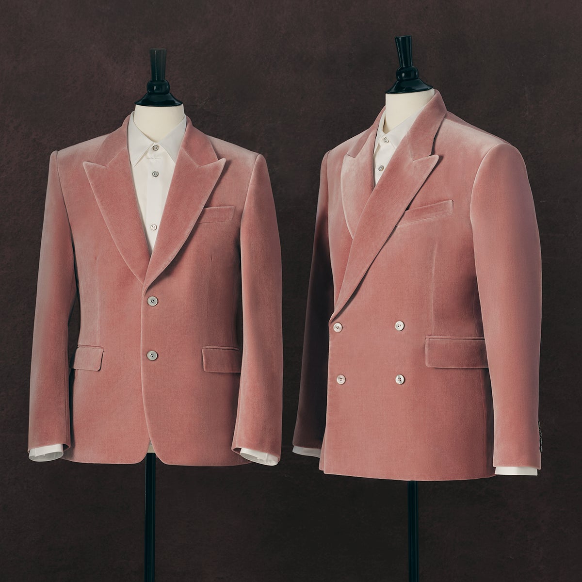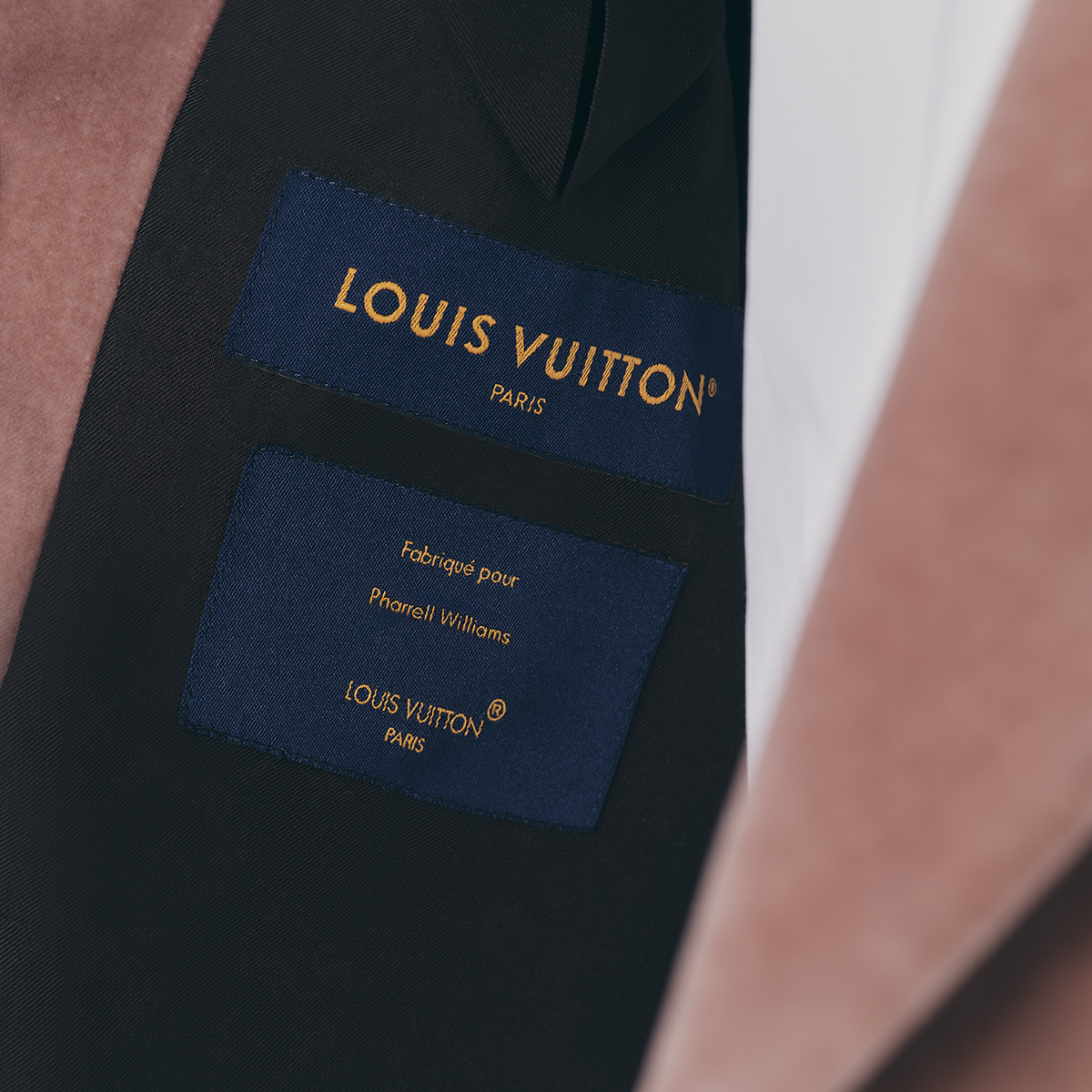 ファレル·ウィリアムスとクリプスがレッドカーペットで着用したウエアは、コットンとシルクのピンクベルベット素材で仕立て、シルクの裏地とマザー·オブ·パール ボタンを使用し、各ジャケットの内側にはカスタムのジャカードラベルが付いています。