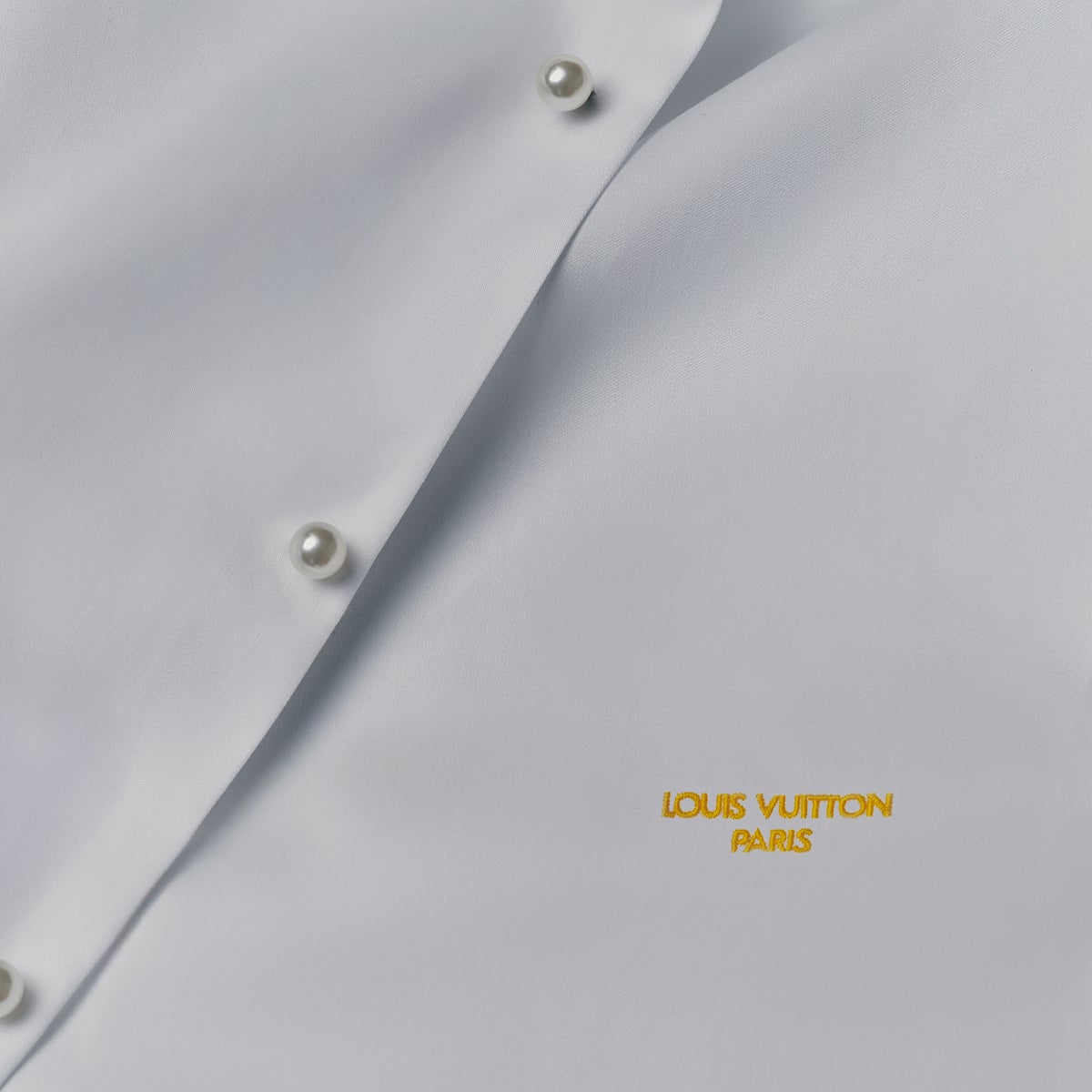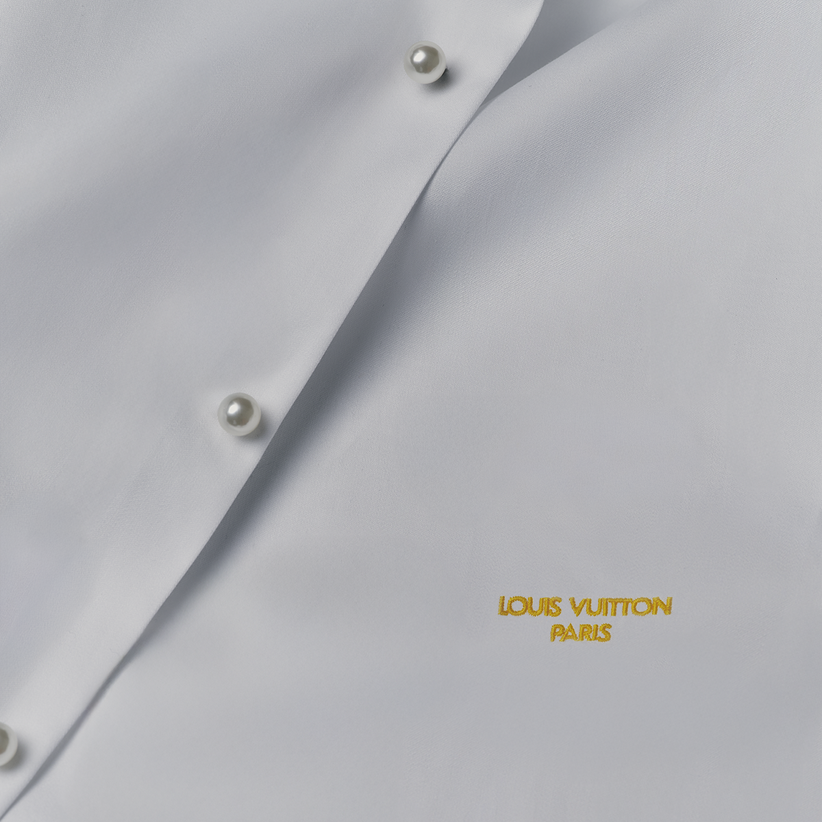 すべてのシャツはシーアイランドコットン製で、マザー·オブ·パール ボタンを採用し、1センチあたり7針という緻密な縫製を施しています。また、ファレル·ウィリアムスのシャツには、左側にイエローの控えめなLV シグネチャーがあしらわれています。