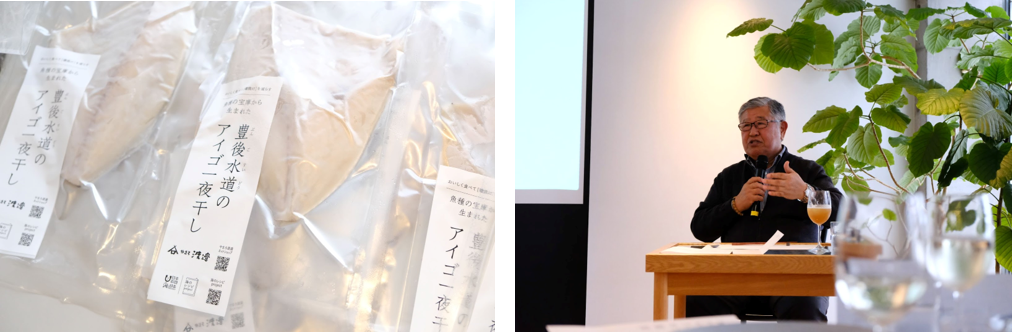 そして2022年、おいしく食べることで「磯焼け」を減少させ、豊かな海の未来につなげていくことを目的とした「豊後水道のアイゴの一夜干し」を共同開発。渡邉会長は値のつかない「アイゴ」を、水揚げされた全量買い取ることからスタートし、地元漁業者たちからの信頼を得るまで地道に取り組んだエピソードなど開発から現在までの歩みを語り、また「アイゴ」だけでなく海の温暖化が加速することで起こりえる問題を伝え、魚食文化を守るためにすでに取り組んでいるプロジェクトの数々を紹介。一つひとつでも私たち消費者ができることを伝え、参加者も熱心に耳を傾けました。
