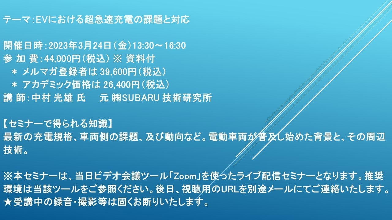 先端技術情報や市場情報を提供している(株)シーエムシー・リサーチ(千代田区神田錦町: https://cmcre.com/ )では、 各種材料・化学品などの市場動向・技術動向のセミナーや書籍発行を行っておりますが、 このたび「EVにおける超急速充電の課題と対応」と題するセミナーを、 講師に中村 光雄 氏 (元 (株)SUBARU 技術研究所)をお迎えし、2023年3月24日(金)13:30より、 ZOOMを利用したライブ配信で開催いたします。 受講料は、 一般:44,000円(税込)、 弊社メルマガ会員:39,600円(税込)、 アカデミック価格は26,400円(税込)となっております(資料付)。