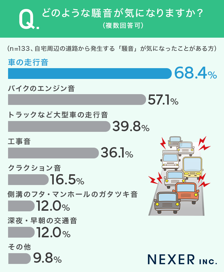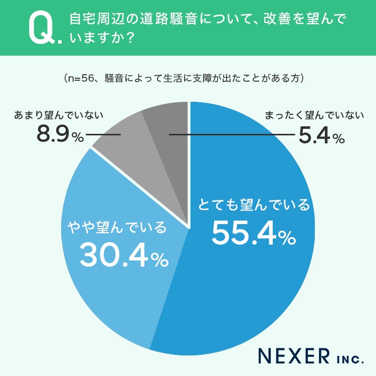 一方で、支障を感じていても7割以上が対策をしていないという結果も見られました。個人での対策には限界があり、道路舗装の改善や交通規制の見直し、静音性の高い道路構造の導入など、インフラ面での取り組みが求められているのかもしれません。