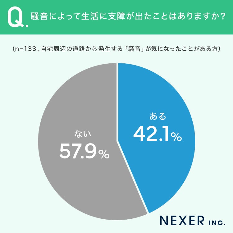 「ある」と回答した人は42.1%、「ない」は57.9%という結果になりました。道路騒音を気にしている人の4割以上が、実際に生活へ何らかの影響を受けていることがわかります。