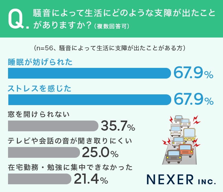 4人に1人が道路騒音に悩み。そのうち睡眠妨害やストレスを訴える人が約7割に