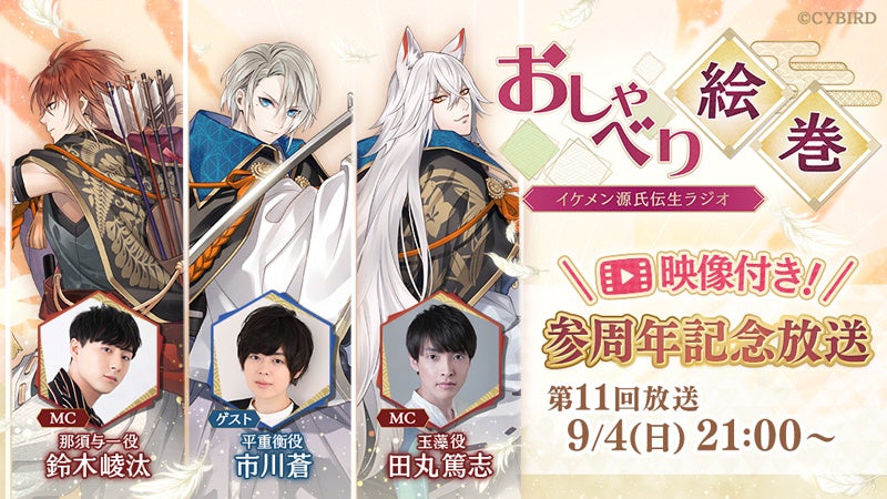 3周年を記念して、2022年9月4日(日)21時より「イケメン源氏伝生ラジオ おしゃべり絵巻」(以下「源ラジ」)の映像配信が決定しました。MCには「玉藻」役の田丸 篤志さん、「那須与一」役の鈴木 崚汰さんを迎え、ゲストには「平重衡」役の市川 蒼さんが出演します。