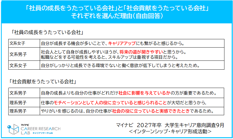 ◆仕事選びでは「社員の成長をうたっている会社」を優先する学生が最多。理由は、「キャリアアップにも繋がる」「将来の道が開きやすいから」という声も