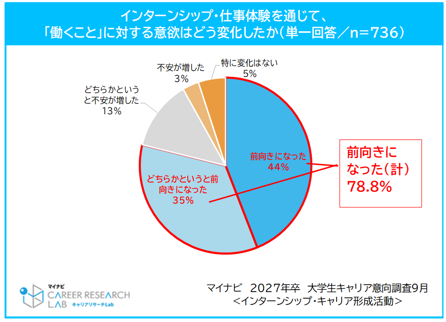インターンシップ・仕事体験を通じて、「働くこと」に対する意欲がどう変化したかを聞いてみたところ、「前向きになった(「前向きになった(44.0%)」+「どちらかというと前向きになった(34.8%)」)」は78.8%と、約8割が働くことに対しての意欲が前向きに変化していることがわかった。