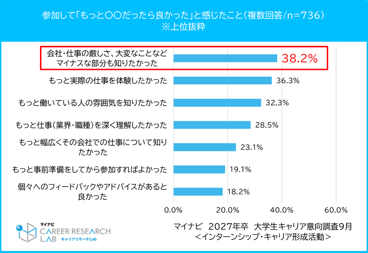 一方で、学生に「インターンシップに参加してみて、もっと○○だったらよかった」と感じたことを聞いてみると「会社・仕事の厳しさ、大変なことなどマイナスな部分も知りたかった」が38.2%で最多となった。学生がインターンシップ・仕事体験の場で“働くことのリアル”に触れる機会を求めており、現場でしか得られないマイナス面も含めてプログラムの中で経験できることを期待していることがわかる。【図2、3、4】