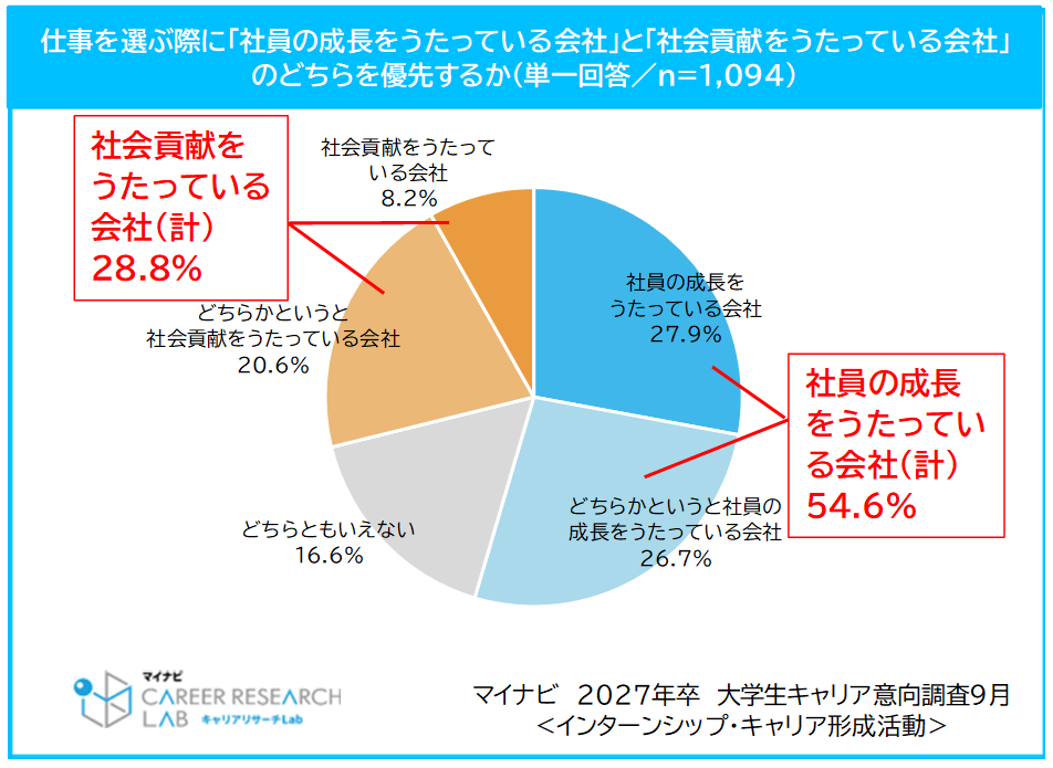 仕事を選ぶ際に「社員の成長をうたっている会社」と「社会貢献をうたっている会社」のどちらを優先するかを聞いたところ、「社員の成長をうたっている会社(計)」は54.6%(「社員の成長をうたっている会社(27.9%)」+「どちらかというと社員の成長をうたっている会社(26.7%)」)で、 「社会貢献をうたっている会社」は28.8%(「社会貢献をうたっている会社(8.2%)」+「どちらかというと社会貢献をうたっている会社(20.6%)」)だった。