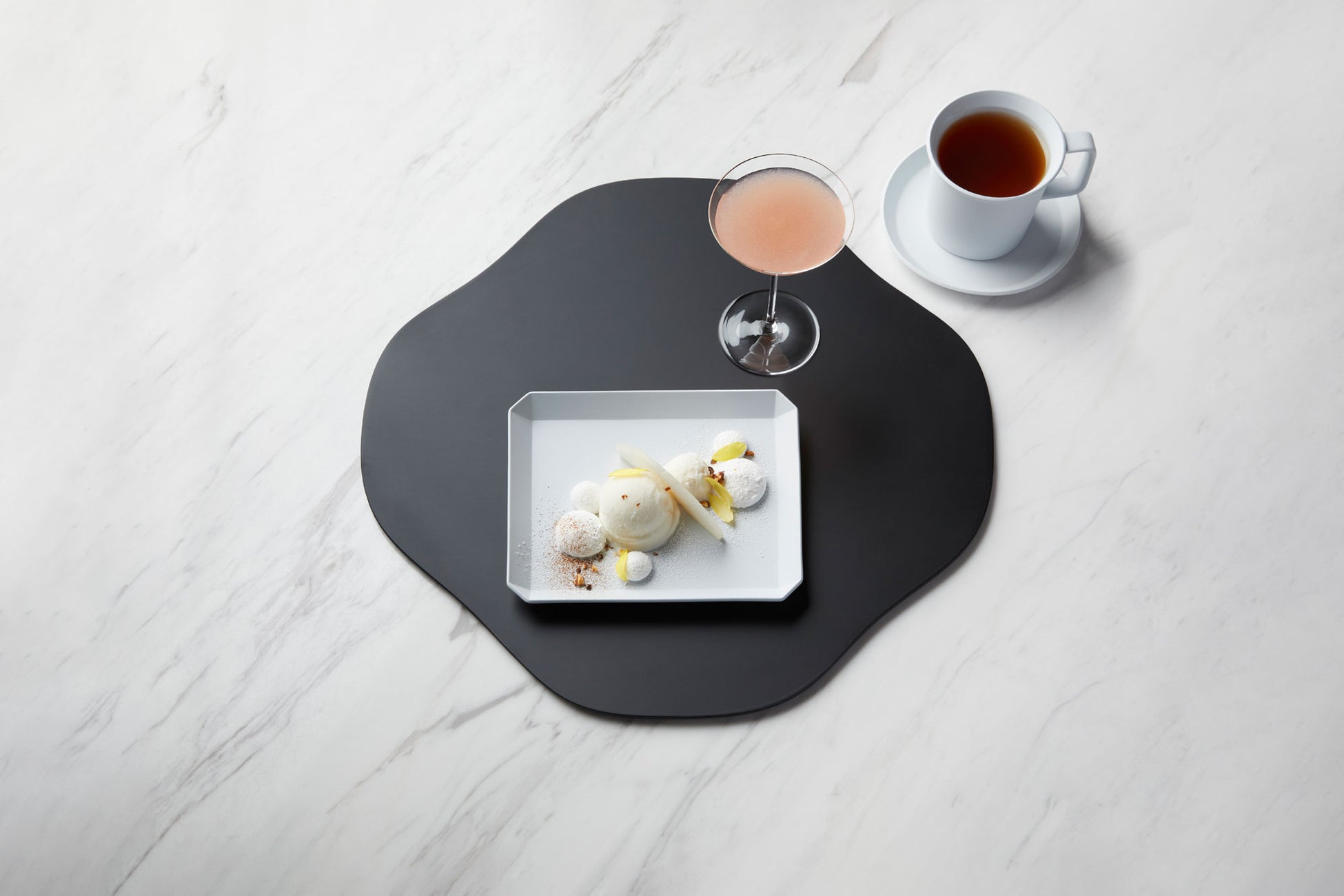 リラックス作用のあるハーブ、リンデンのソルベとミルクジェラート、洋梨を盛り合わせ、レモンとはちみつ*のマシュマロ、ヘーゼルナッツ、シナモンを添えた一皿に、洋梨とラベンダーのスープを組み合わせました。くつろぎのひとときや、一年間頑張った自分へのご褒美としてもおすすめのデザートです。