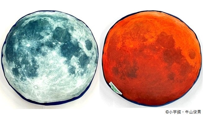 NEO 月でくらす展賞の賞品は、月のかたちをしたふわふわのクッション。表裏に満月と皆既月食がプリントされています。