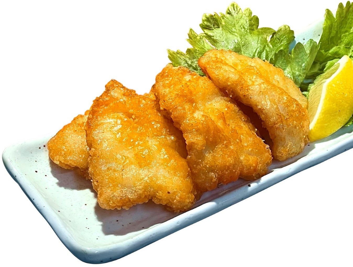 国産のまふぐをふっくらとおいしく揚げました。カリッとした衣の中には、旨みが詰まったぷりぷりの身が。