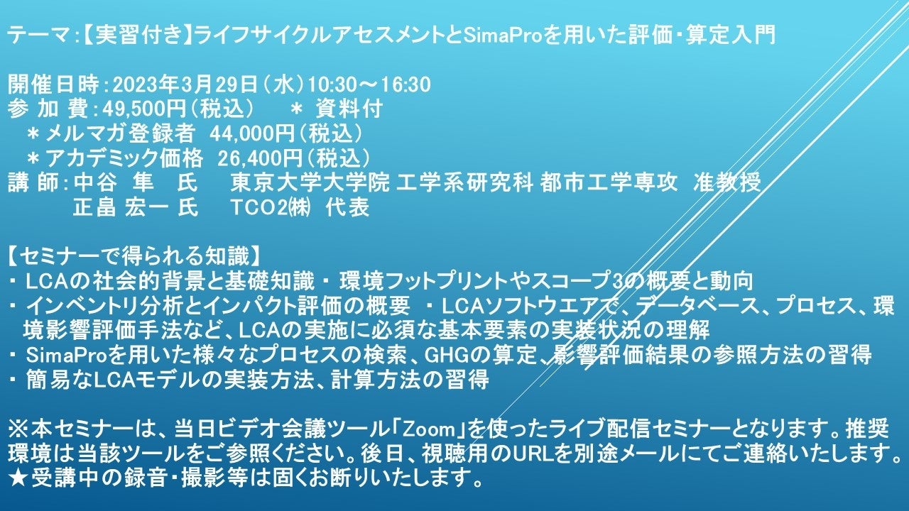 先端技術情報や市場情報を提供している(株)シーエムシー・リサーチ(千代田区神田錦町: https://cmcre.com/ )では、 各種材料・化学品などの市場動向・技術動向のセミナーや書籍発行を行っておりますが、 このたび「【実習付き】ライフサイクルアセスメントとSimaProを用いた評価・算定入門」と題するセミナーを、 講師に中谷 隼 氏 (東京大学大学院 工学系研究科 都市工学専攻 准教授) 正畠 宏一 氏 (TCO2(株) 代表)をお迎えし、2023年3月29日(水)10:30より、 ZOOMを利用したライブ配信で開催いたします。 受講料は、 一般:49,500円(税込)、 弊社メルマガ会員:44,000円(税込)、 アカデミック価格は26,400円(税込)となっております(資料付)。