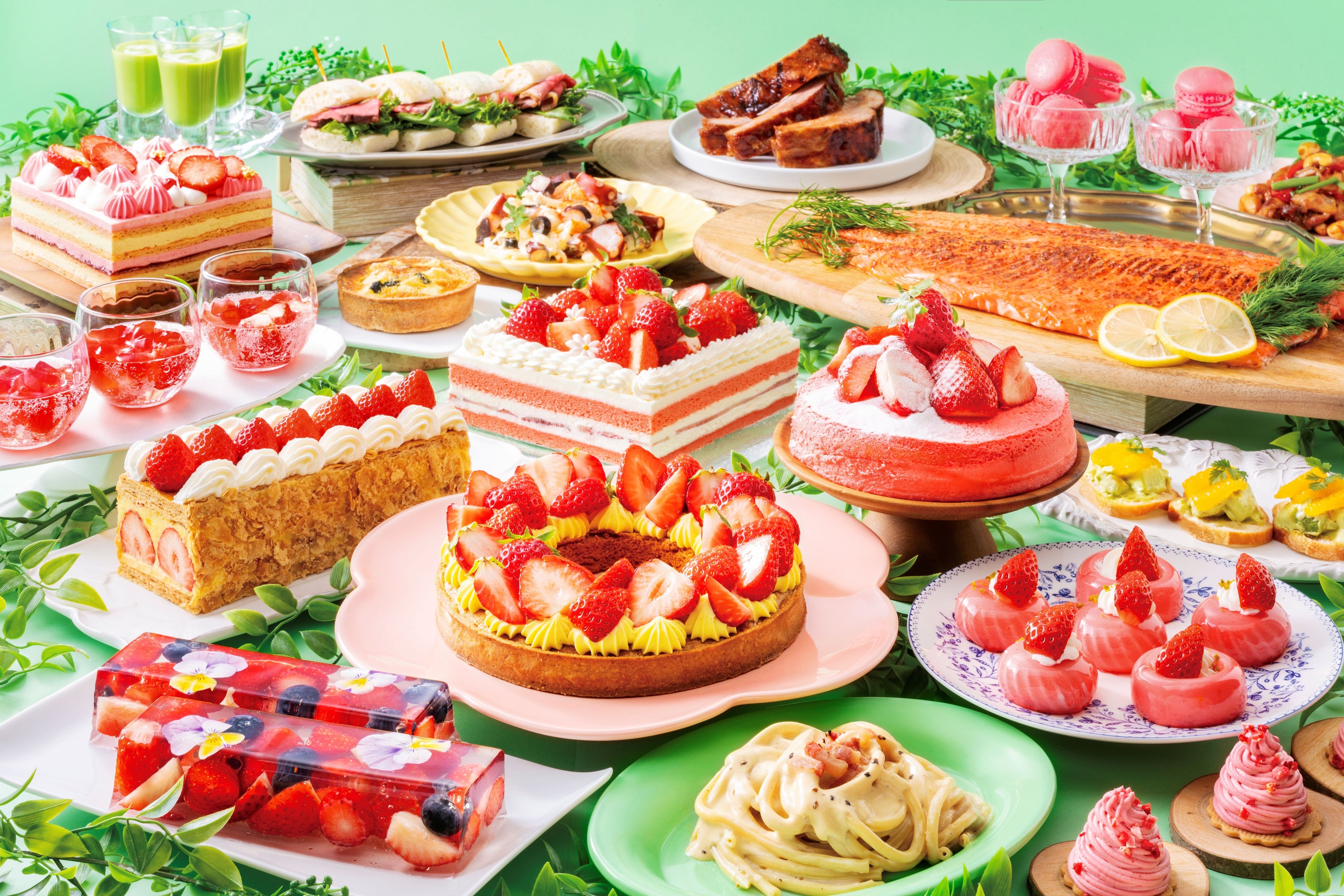 甘酸っぱくみずみずしい、旬のいちごの魅力を存分にご堪能いただけるスイーツ全20種をご用意しました。「ショートケーキ」や「タルト」「スフレチーズケーキ」「ゼリーテリーヌ」などの王道スイーツが、フレッシュな果実感を満喫できる、まさに“いちご尽くし”のラインアップ。さらに、スタンドクッキングには「いちごのナポレオンパイ」が初登場。サクサクのパイを目の前でカッティングし、いちごソースをかけて仕上げ、心ときめくひとときを演出します。そのほか、ホールチーズの上で溶かしながら仕上げる「スパゲッティ・カルボナーラ」や、人気の「オーブンベイクドスモークサーモン」など、フードメニューも充実しており、ランチビュッフェとしても存分にお楽しみいただけます。