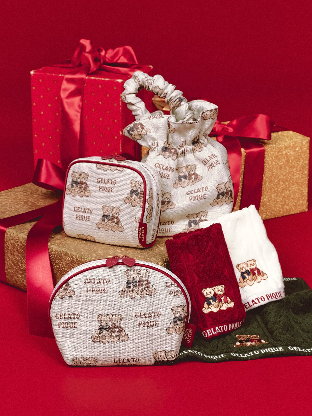 用途によってサイズが選べる3種類のポーチに、コットン100%のハンドタオル、立体的なベアとハートのチャーム。