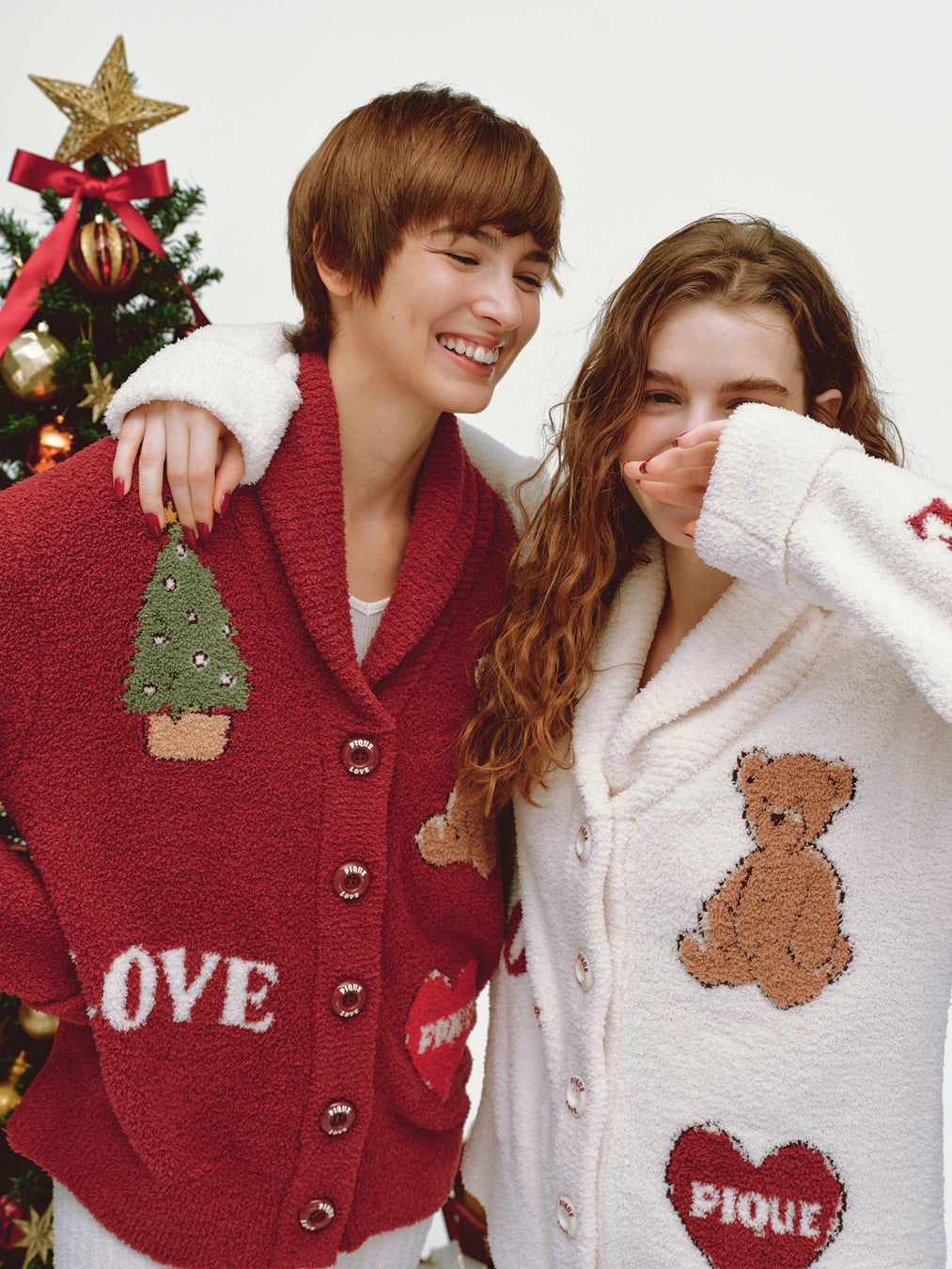 テーマである"LOVE"のロゴやツリー、ベア、ハートをツリーのオーナメントに見立て散りばめたジャカードのショールカーディガン。