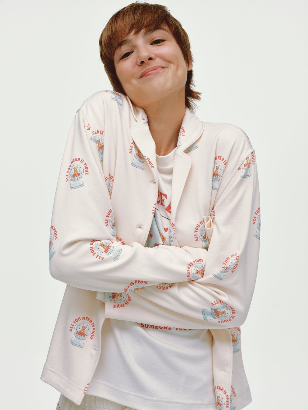 ベアの上に雪とハートが舞うスノードーム柄のルームウェア。