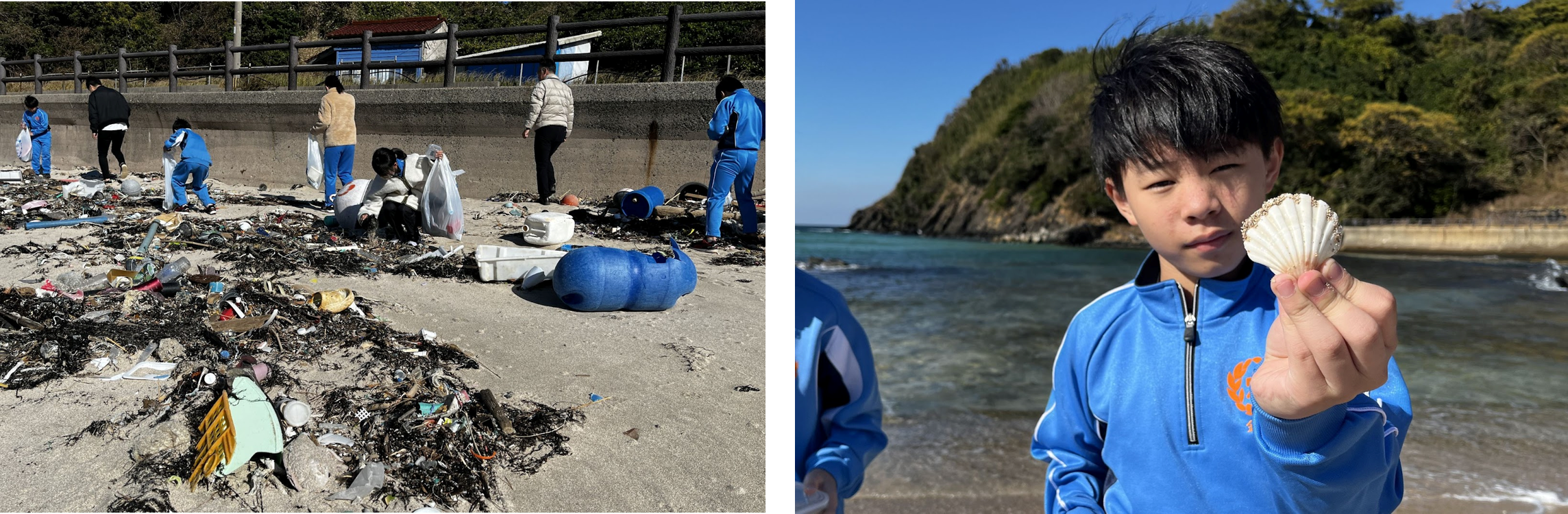 子どもたちは、実際に砂浜に出てビーチコーミングを行いました。悪天候が続いた後の海岸には、大量のごみが打ち上げられていて、ごみの中にきれいな貝が落ちていました。
