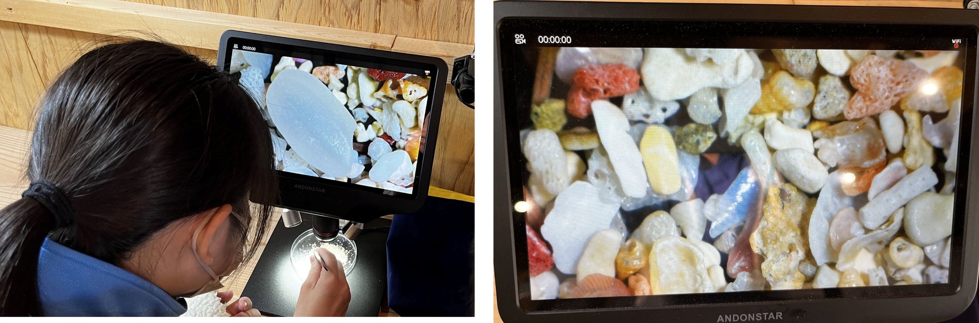 11月22日には、大野小学校の5、6年生9人が参加しました。小波海水浴場の貴重な環境について、講師を務める島根大学の松本一郎教授や島根半島・宍道湖中海ジオパーク認定ジオガイドの召古裕士さんから説明を受けた子どもたちは、小波海水浴場の砂を顕微鏡で観察しました。肉眼で見ると普通の砂にしか見えない粒は、驚くことに色とりどりの貝の欠片の集まりでした。
