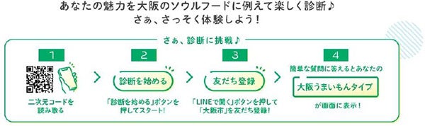 市公式LINEに友だち登録し、オンラインで複数の簡単な質問に答えるだけで、あなたの魅力を大阪のソウルフード(うまいもん)8タイプに例えて、登録した方の魅力を分析する診断ゲームです。診断結果のタイプにあわせて、大阪市が勧める施設や施策といった市政情報もお届けします。無料でお楽しみいただけ、すでに市公式LINEに友だち登録をされている方もご参加いただけます。