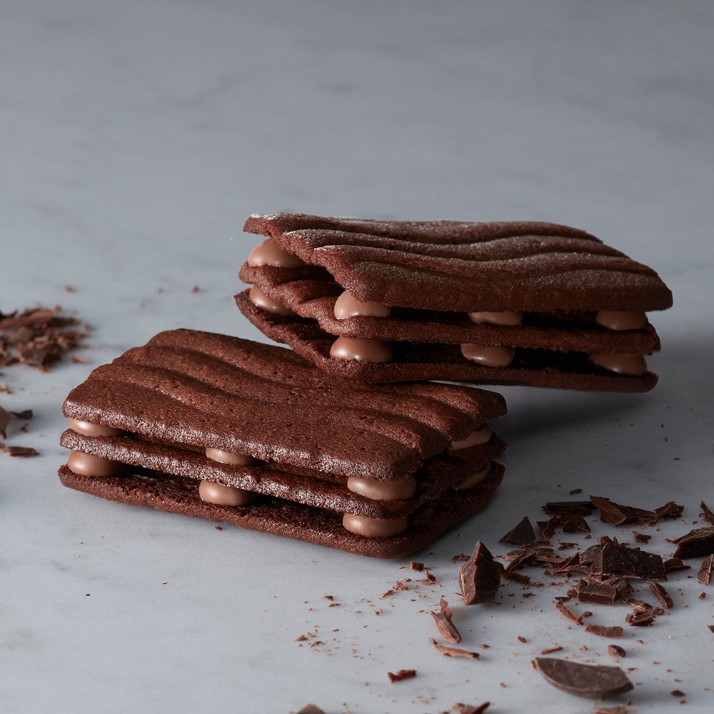 ➀スペシャリティチョコレートの味を追求した一品。三層のラングドシャが放つ本物の香りと味。カカオアロマ、フルーティな風味、ユニークな酸味が広がります。