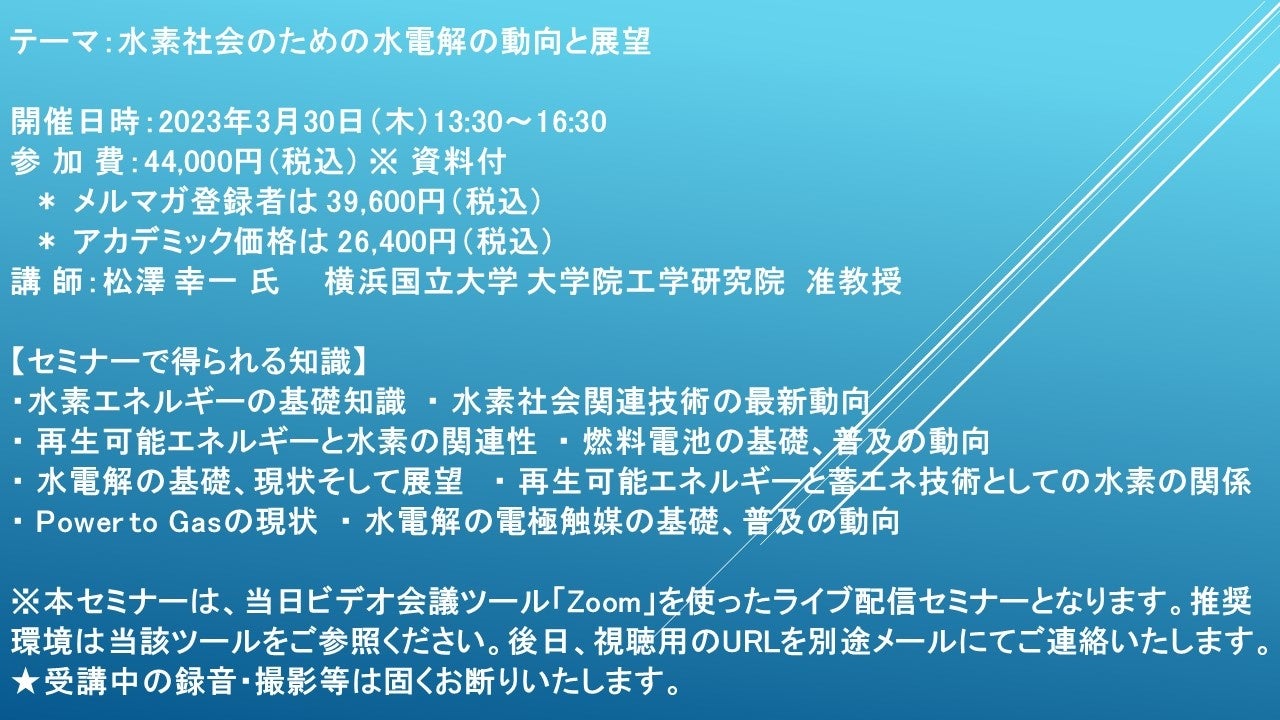 先端技術情報や市場情報を提供している(株)シーエムシー・リサーチ(千代田区神田錦町: https://cmcre.com/ )では、 各種材料・化学品などの市場動向・技術動向のセミナーや書籍発行を行っておりますが、 このたび「水素社会のための水電解の動向と展望」と題するセミナーを、 講師に松澤 幸一 氏 (横浜国立大学 大学院工学研究院 准教授)をお迎えし、2023年3月30日(木)13:30より、 ZOOMを利用したライブ配信で開催いたします。 受講料は、 一般:44,000円(税込)、 弊社メルマガ会員:39,600円(税込)、 アカデミック価格は26,400円(税込)となっております(資料付)。