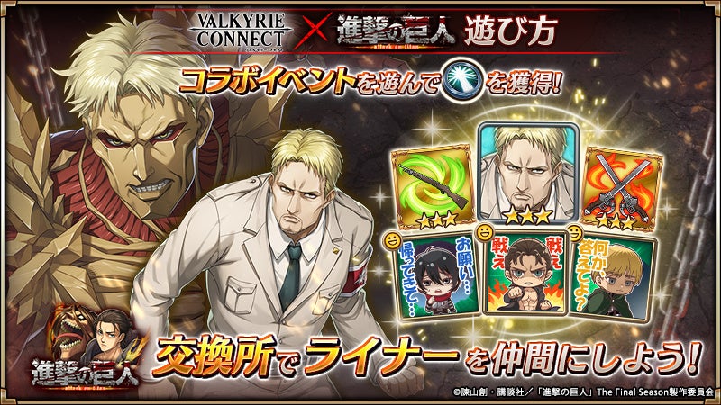 株式会社エイチームのグループ会社である株式会社エイチームエンターテインメント(本社:愛知県名古屋市、代表取締役社長:中内之公)は、ハイファンタジーRPG『ヴァルキリーコネクト』(ヴァルコネ)にて、2023年2月15日(水)より、TVアニメ『進撃の巨人』とのコラボを開催します。※本コラボは『ヴァルコネ』を配信する全世界で同時開催します。