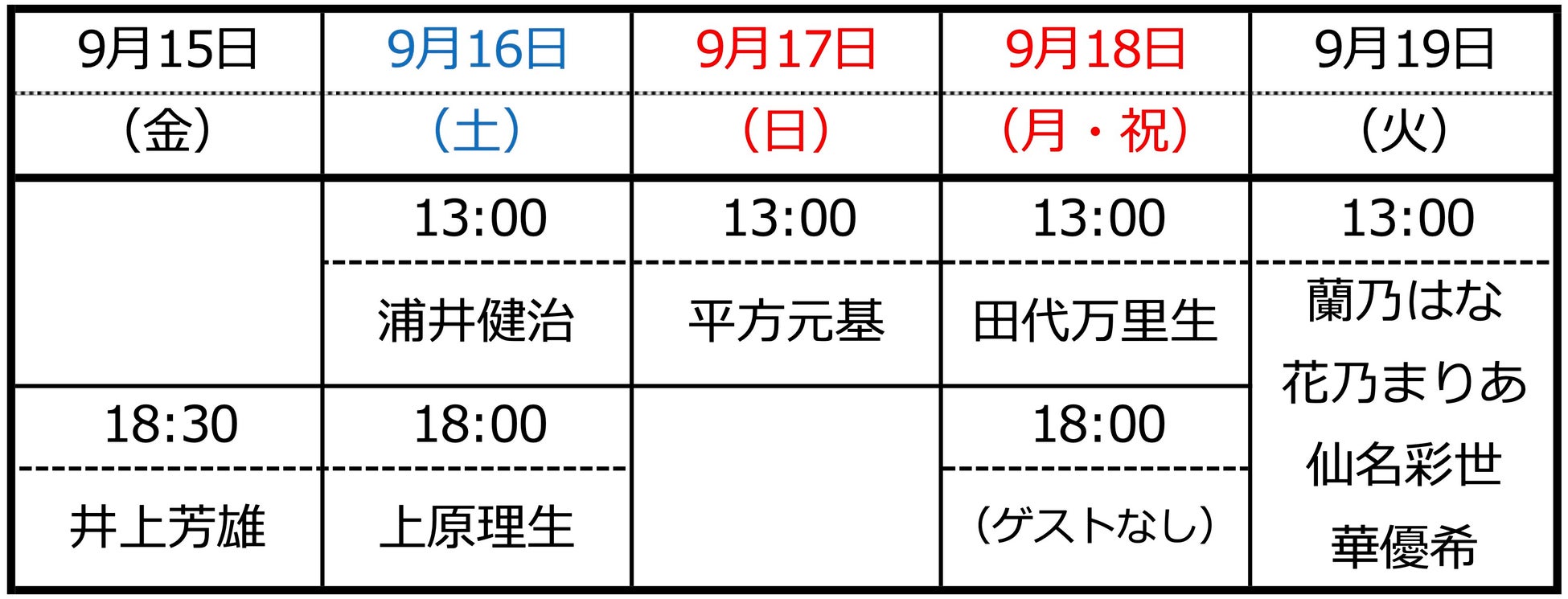 明日海の20周年を祝うべく駆けつけるのは、井上芳雄(9月15日)、浦井健治(16日昼)、上原理生(16日夜)、平方元基(17日)、田代万里生(18日昼)、蘭乃はな&花乃まりあ&仙名彩世&華優希(19日)、山崎育三郎(22日)、古川雄大(23日夜)、凪七瑠海(宝塚歌劇団/24日)。錚々たる顔ぶれで、まさにミュージカル界のスター総集結といった趣だ(18日夜・23日昼のみゲストなし)。井上、浦井、田代は『ガイズ&ドールズ』、上原は『エリザベス・アーデンvs.ヘレナ・ルビンスタイン -WAR PAINT-』、平方は『マドモアゼル・モーツァルト』でそれぞれ明日海と共演しており、当時の感動が蘇るようなセッションに期待が高まる。また山崎、古川とは彼らのコンサートでタッグを組んでおり、新たな化学変化が楽しみだ。