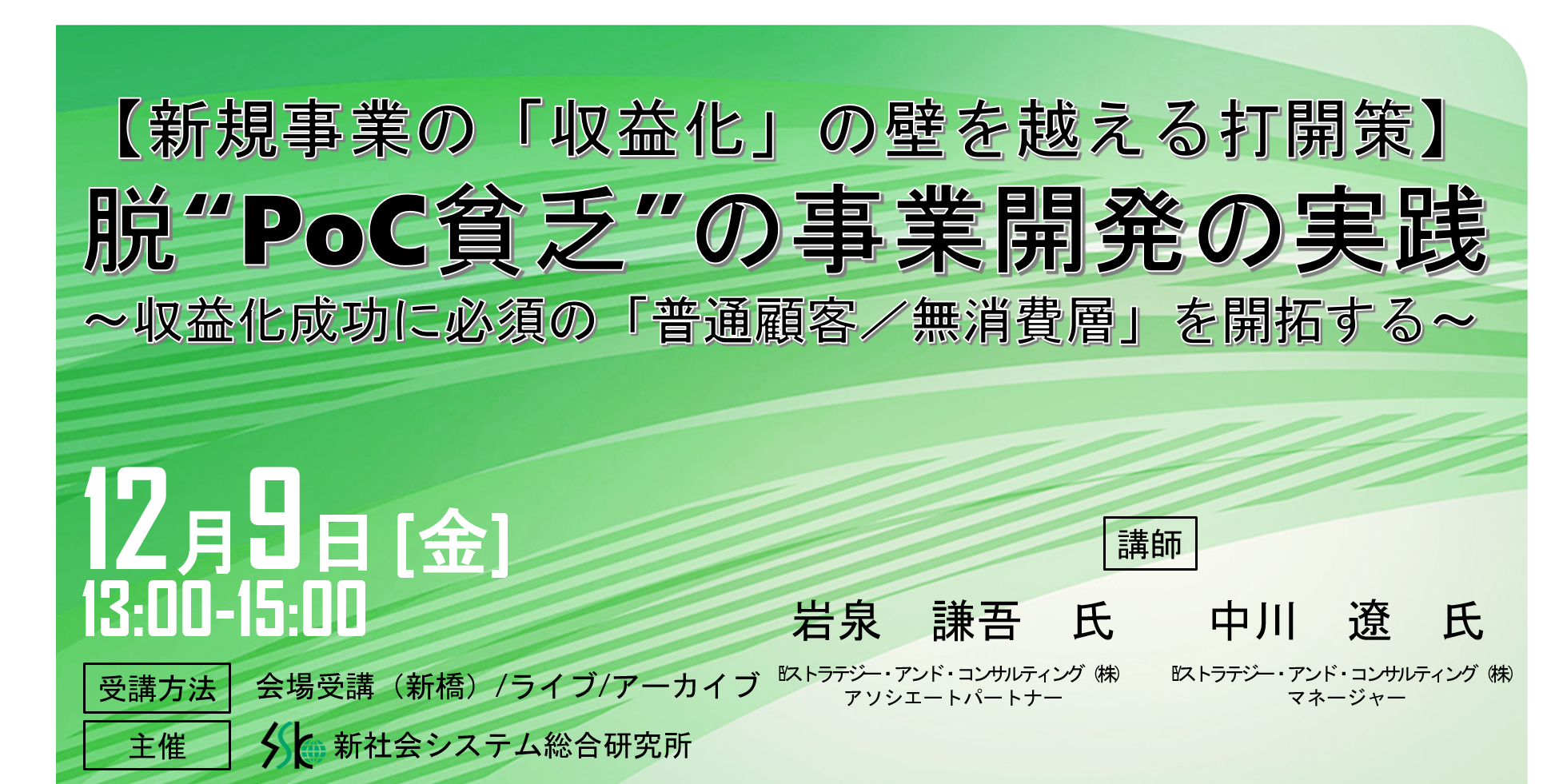 今回のセミナーでは、新規事業の大きな課題である「収益化」に焦点を当てながら、「収益化」の原因を論理的に分析しながら、新規事業が「PoC貧乏」から脱するための打開策をご紹介します。