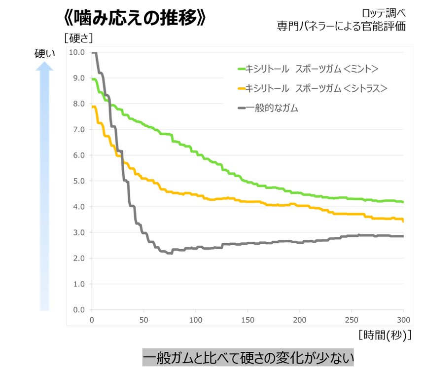 (*1)当社の一般的な食感のガムと比較して硬さの変化が少ないこと(ロッテ調べ)
