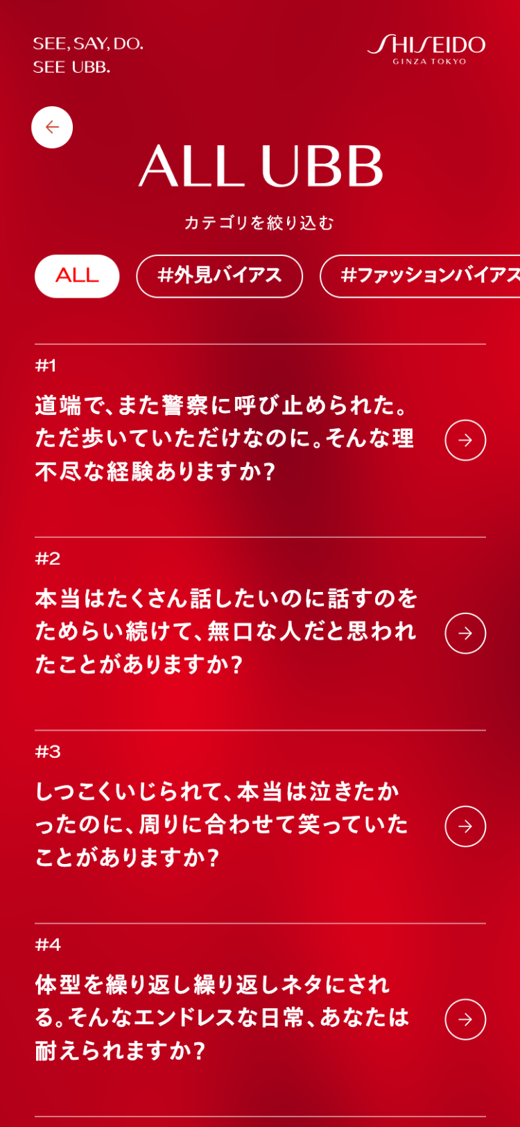 SAYのフェーズでは、SEEで学んだことや自らの体験や思いを共有、そして議論します。第一弾として、資生堂社員にとってのUBBとは何か、それぞれがUBBに対して感じること、向き合い方について語った動画を9月21日(水)より公開いたします。また、人々が抱える思い込みや偏見について語ったり、実際にUBBを感じた体験談などを通じて議論し、世の中の声を聞くためのツールとして、Instagramのフィルターも9月21日(水)より配布いたします。