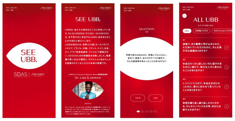 SHISEIDOは、持続可能な開発目標(SDGs)に対し2020年10月から「Sustainable Beauty Actions(サステナブル・ビューティー・アクションズ、以下SBAS)」に取り組んでいます。SBASは「MOTTAINAI(リサイクルやリユース)」、「HARMONY(社会や環境との調和)」、「EMPATHY(共鳴)」という3つの柱で構成され、これまでに「MOTTAINAI」と「HARMONY」の柱に沿った具体的なアクションを行ってきました。今回始動する3つ目の柱「EMPATHY」では、SHISEIDOの目指す、性別、年齢、国籍などにとらわれず、誰もが自分らしく人生を楽しみ、個々の美しさに共鳴しあえる世界の実現にむけた第一歩として、「Unconscious Beauty Bias(UBB)」に注目した、「SEE,SAY,DO.」プロジェクトを展開していきます。