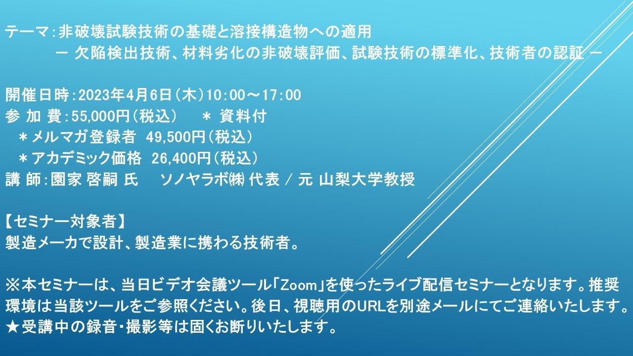 先端技術情報や市場情報を提供している(株)シーエムシー・リサーチ(千代田区神田錦町: https://cmcre.com/ )では、 各種材料・化学品などの市場動向・技術動向のセミナーや書籍発行を行っておりますが、 このたび「非破壊試験技術の基礎と溶接構造物への適用- 欠陥検出技術、材料劣化の非破壊評価、試験技術の標準化、技術者の認証 -」と題するセミナーを、 講師に園家 啓嗣 氏 (ソノヤラボ(株) 代表 / 元 山梨大学教授)をお迎えし、2023年4月6日(木)10:00より、 ZOOMを利用したライブ配信で開催いたします。 受講料は、 一般:55,000円(税込)、 弊社メルマガ会員:49,500円(税込)、 アカデミック価格は26,400円(税込)となっております(資料付)。
