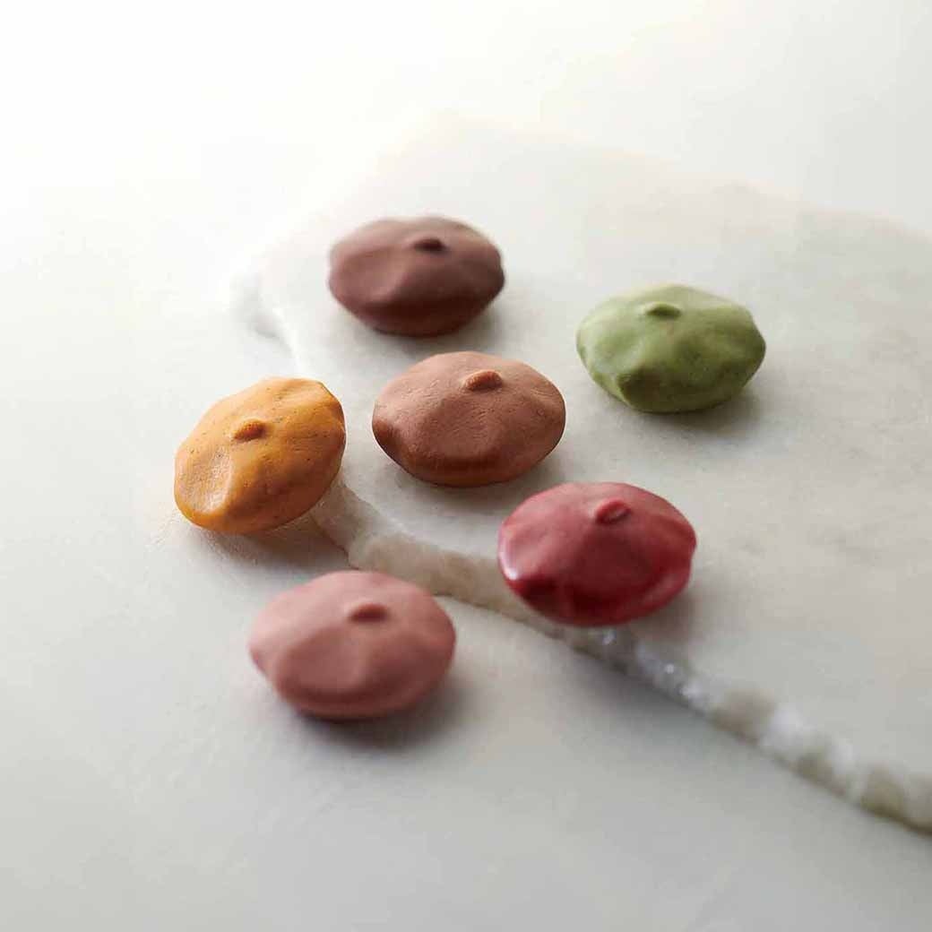 フランボワーズ、シトロン、ピスタ―シュのマカロンを、ビターチョコでコーティング。